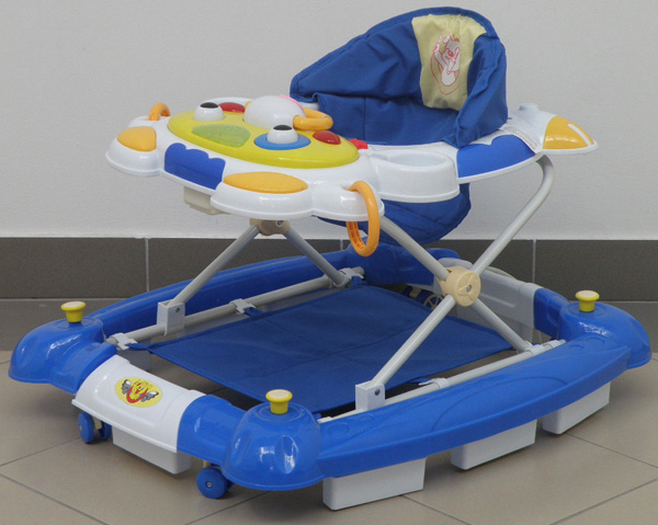Laufhilfe für blaue und weiße Babywalker mit Pendelfunktion und eine abnehmbare, musikalische Spielekonsole. Verpackung: transparenter Folienbeutel