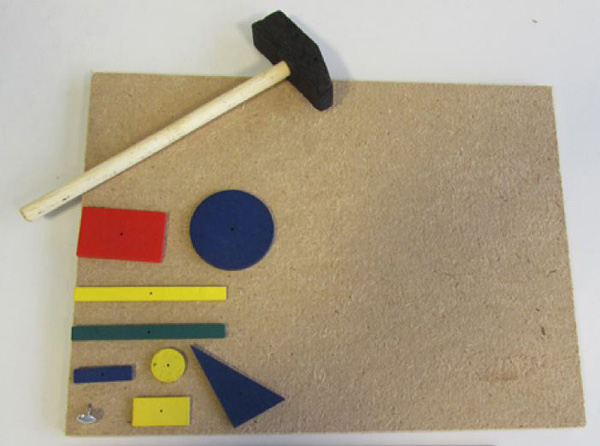 Holzspielzeug aus flachen Holzstücken in verschiedenen Farben und Formen, Metallnägel, Holzhammer, Rechteckspanplatte aus Pappe, Lieferung in einer Pappschachtel.